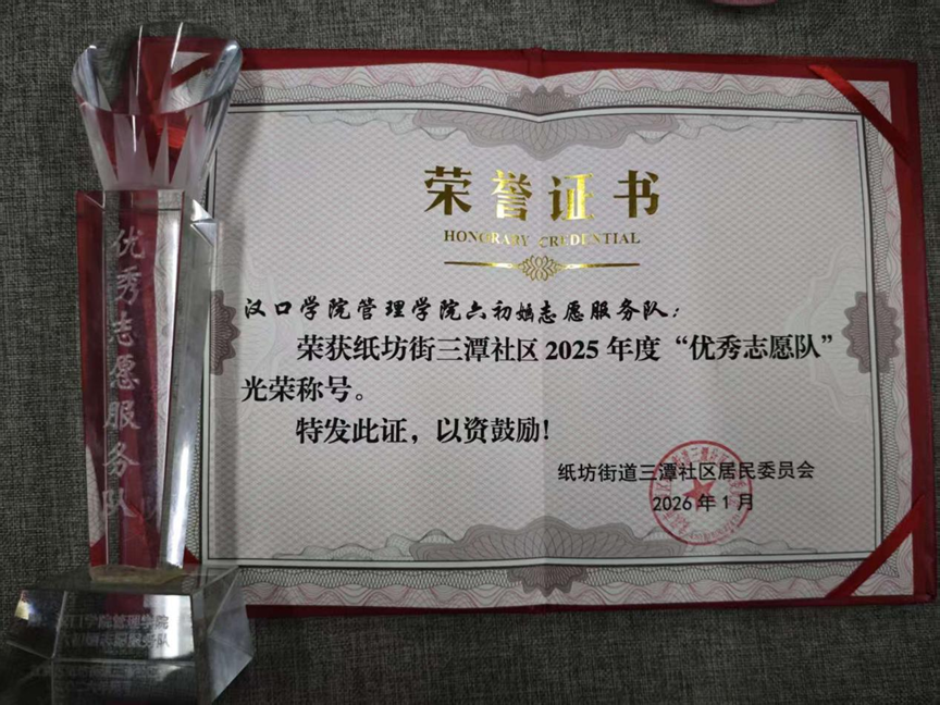 加强“六初婳志愿服务队”力量,吸引百余名同学加入,全年开展“彩韵岁月·温暖同行”关爱老人、“绿色校园·青春同行”环保宣传、“书香浸润·公益助学”等志愿服务活动18次,累计服务时长千余小时。六初婳志愿服务队凭借优异表现,再次被纸坊街道三潭社区评为“优秀志愿者团队”,彰显管理学院青年的责任与担当。