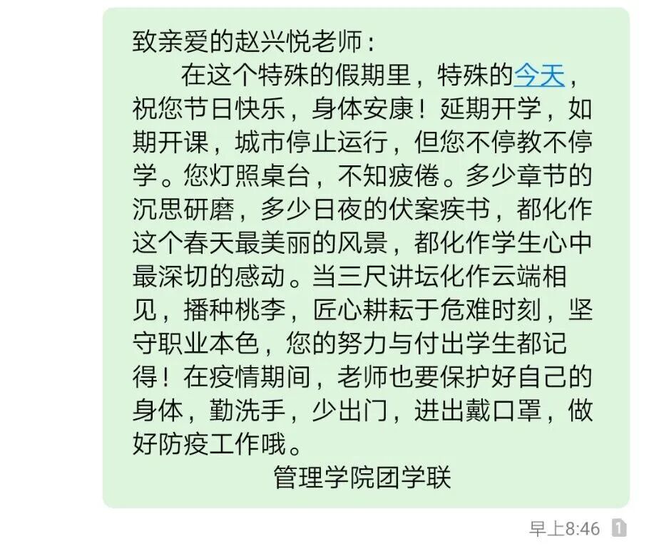 在今天,团学联会在网络上以文字形式对老师送去祝福,表现我院学子对老师的孺慕之情。除此之外,他们最为关切的是要老师们在疫情期间注意安全,此外便是切莫为了教学而损坏身子!