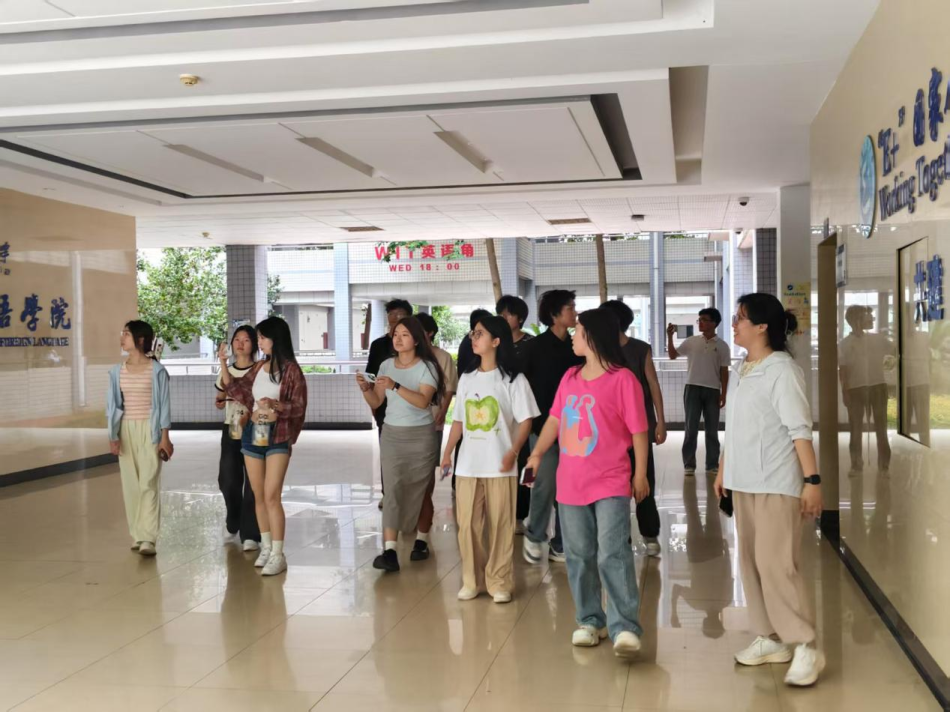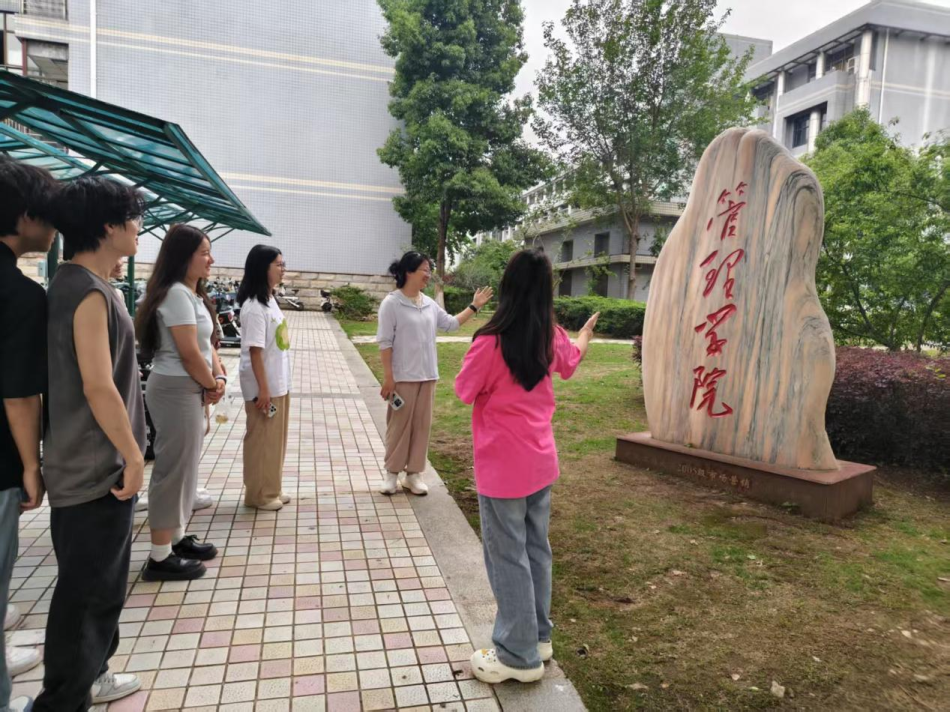 在引导员带领下,管理学院学生们先后来到图书馆、静思湖、校体育场等学习休闲区域,深入了解武汉工程大学的校园生活特色与环境布局。随后,一行人走进管理学院教学楼,现场聆听专业办学经验分享,就学科建设、学生活动等话题展开交流。