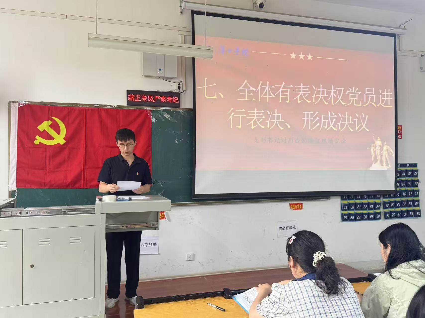 随后,由党务助理代为宣读入党介绍人对所联系发展对象的综合考察报告,陈述具体考察情况及是否同意接收其为预备党员的意见。全体发展对象逐一进行表态发言,并表明今后将持续加强理论学习、提升服务群众能力、以更高标准严格要求自己。经支委会汇报审查情况和发展意见后,与会党员充分讨论并进行了无记名投票表决,随后张超同志宣布投票结果:管理学院学生党支部全票同意接收陈思雨、丁依、佘诗佳等13名发展对象为中共预备党员。